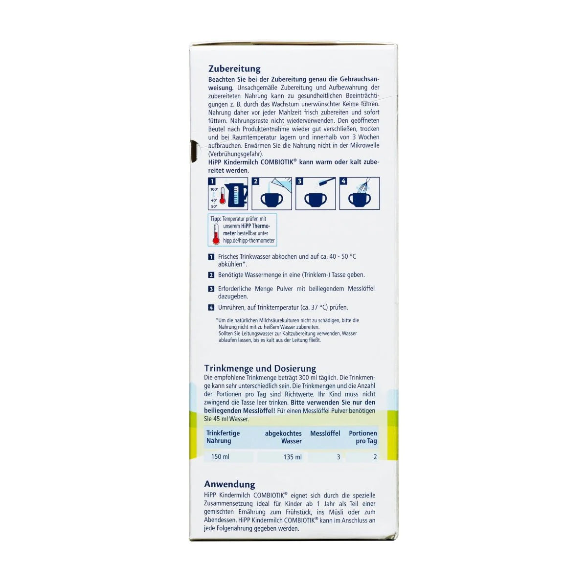It is recommended to drink 2 cups of HiPP Combiotik per day. Your child does not necessarily have to drink the entire amount of the milk drink. Use the measuring