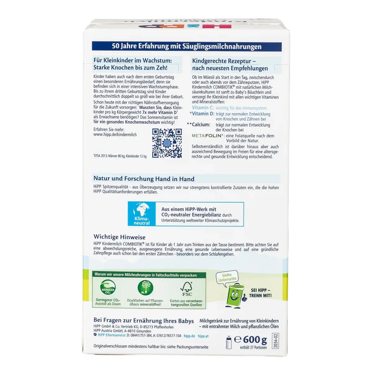 It is recommended to drink 2 cups of HiPP Combiotik® 4 per day. Your child does not necessarily have to drink the entire amount of the milk drink. Use the measuring